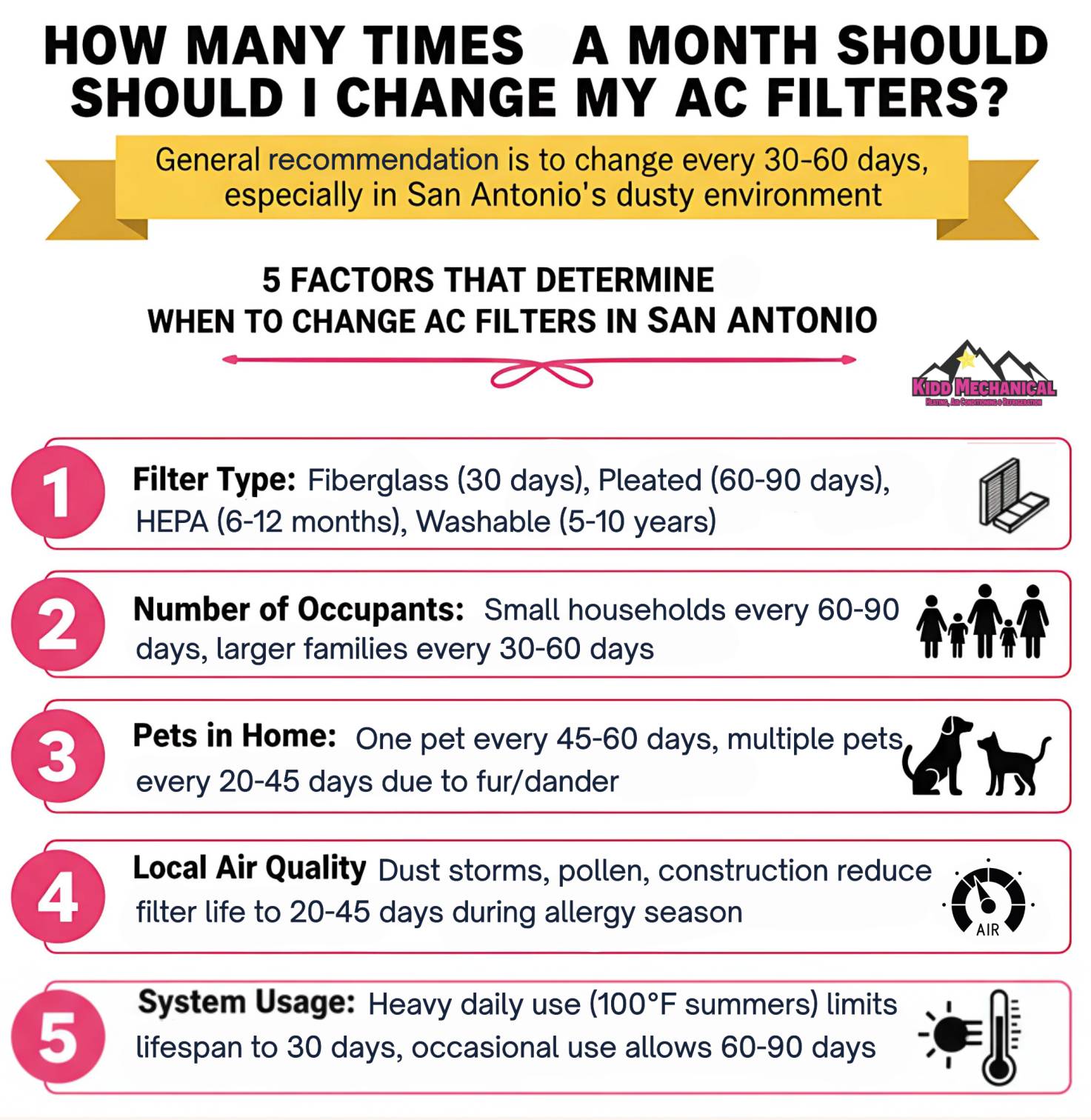 According to the Department of Energy, homeowners should change their AC filters once every 30 to 60 days during the cooling season. However, San Antonio’s subtropical climate and lifestyle factors often mean you might need to change the filters more frequently. That’s because high levels of dust, pet dander, and heavy AC usage during the sweltering Texas summers can shorten your HVAC filter’s lifespan.